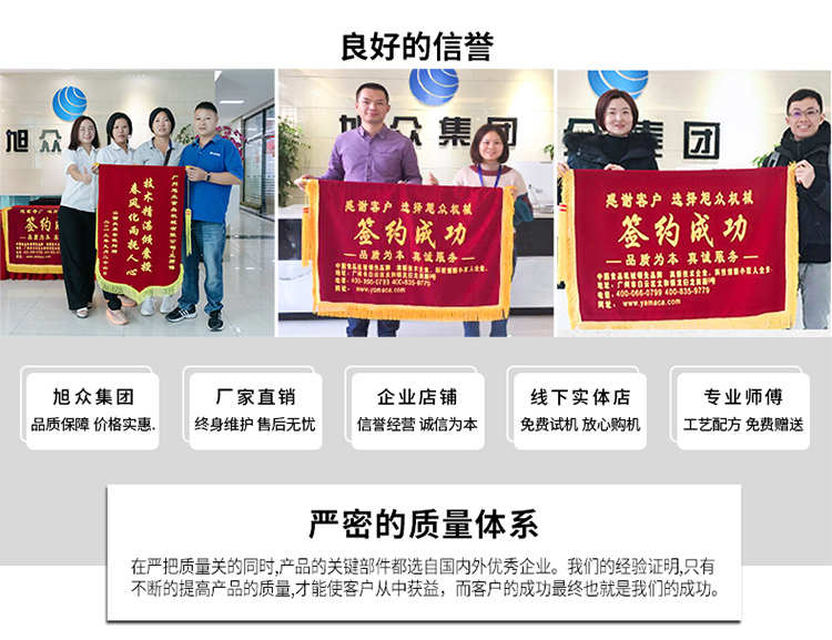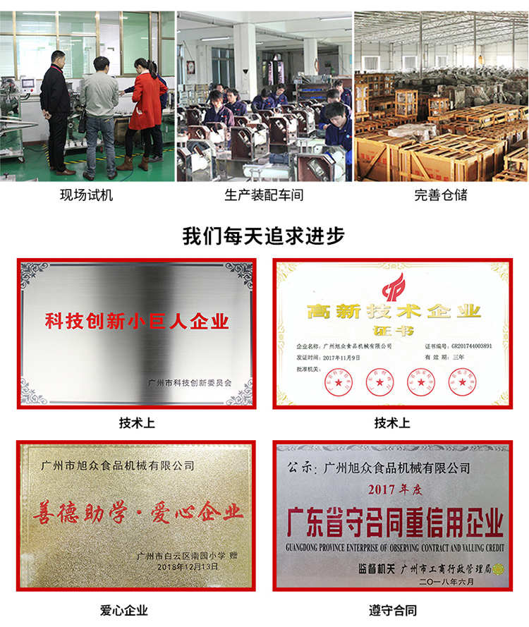 廣州旭眾食品機械有限公司是一家集科研開發(fā),生產(chǎn)設(shè)計,營銷服務(wù)為一體的現(xiàn)代化生產(chǎn)企業(yè)。現(xiàn)代化生產(chǎn)車間,精湛制造技術(shù),所產(chǎn)機械歷經(jīng)市場重重考驗,不斷贏得海內(nèi)外客戶的贊譽。